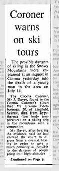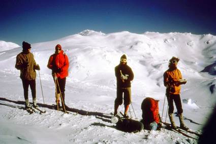 In those days you could catch a Pioneer bus from Canberra to Thredbo, which we did. Whether we stayed in Thredbo or not I can’t recall but on or about Friday 14 July we took the ski lift in goodish weather and skied from the top station towards Mt Kosciuszko, above Rawson Hut and finishing up at Lake Albina Lodge for the night. Now long gone, this was a private ski lodge that was not locked – so we availed ourselves of the luxury of real mattresses to sleep on. Little did we know that at that time two ski tourers were caught in a blizzard near Tin Hut, with one skier unfortunately losing his life from hypothermia.