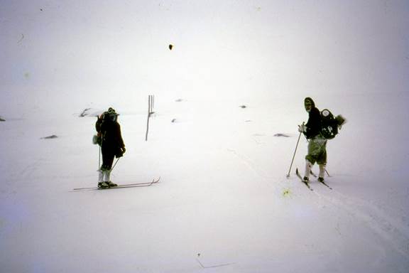 The weather was not much better. On a direct course without good visibility we skied up hill and down dale. I recall going around Table Top Mountain but not much else till after a few hours struggling through patches of soft snow we found ourselves amongst tombstones! I thought “did we succumb and cross over to the cold side?”