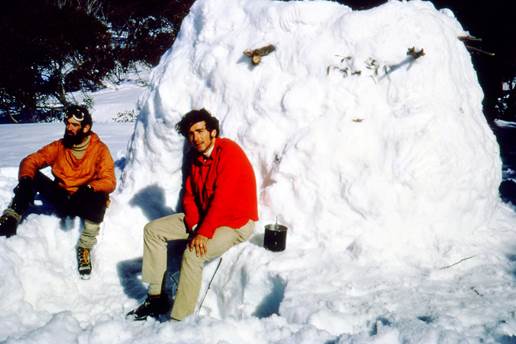 I still recall the swishing sound of our skis, the snow laden trees and the awesome freedom. At one stage a large wombat trundled across our path. I’m not sure now what time we set out and what time we arrived but our next shelter was O’Keefes Hut. I was feeling a bit “off” with an attack of the runs so we decided to rest a day here. We thought we would try to build an igloo, to practice our survival skills – we learnt it was not a very practical idea as it took most of the day (using a snow saw) to complete it. We couldn’t construct the roof with snow so used sticks and branches.